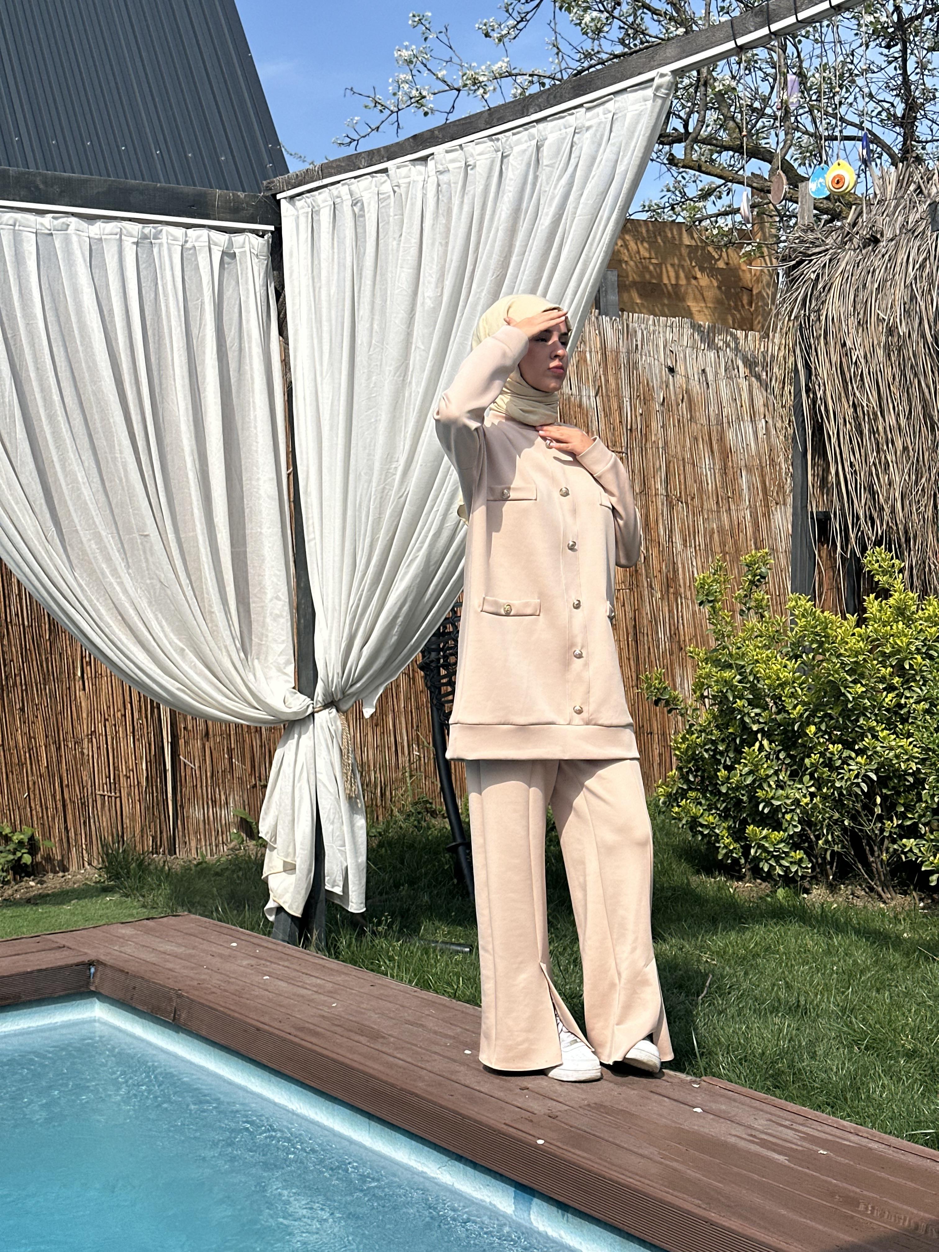 Gold Düğmeli İkili Takım, ofis ortamında şık bir iş stili oluşturmak için mükemmel bir seçimdir. Ayna karşısında yaratacağınız kombinler ile davetlere, özel gecelere ya da günlük etkinliklere katılabilirsiniz. Altına giyeceğiniz klasik topuklu ayakkabılarla sofistike bir görünüm elde edebilirsiniz. Ayrıca spor ayakkabılarla ise rahat ve şık bir günlük stil oluşturabilirsiniz.