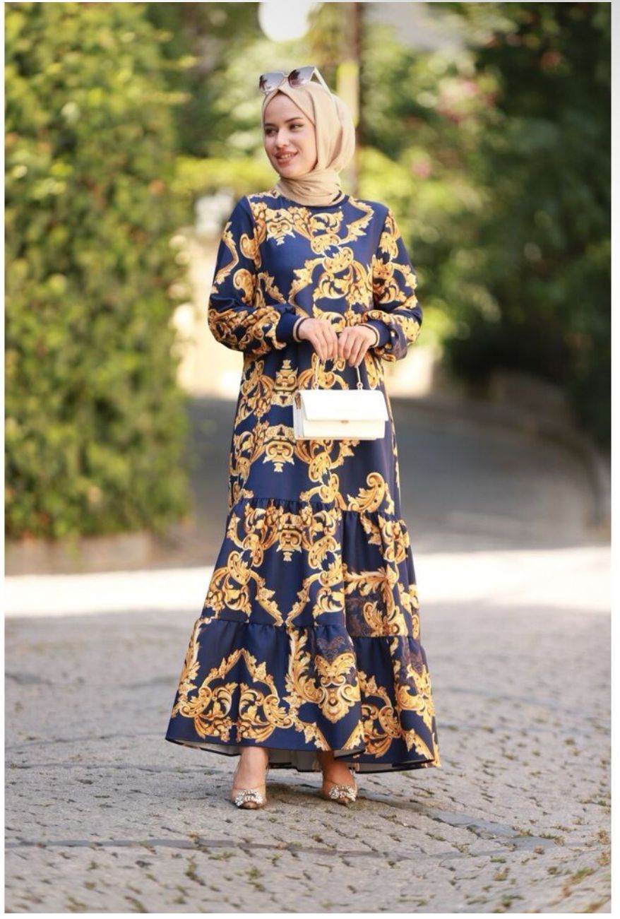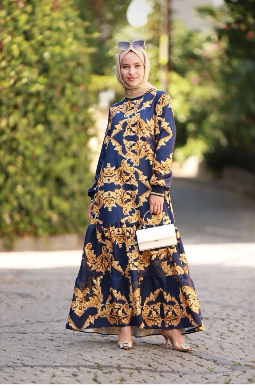 ZİNCİR DESEN TAM BOY LACİVERT ELBİSE İLE ŞIKLIĞINIZA ŞIKLIK KATIN.
